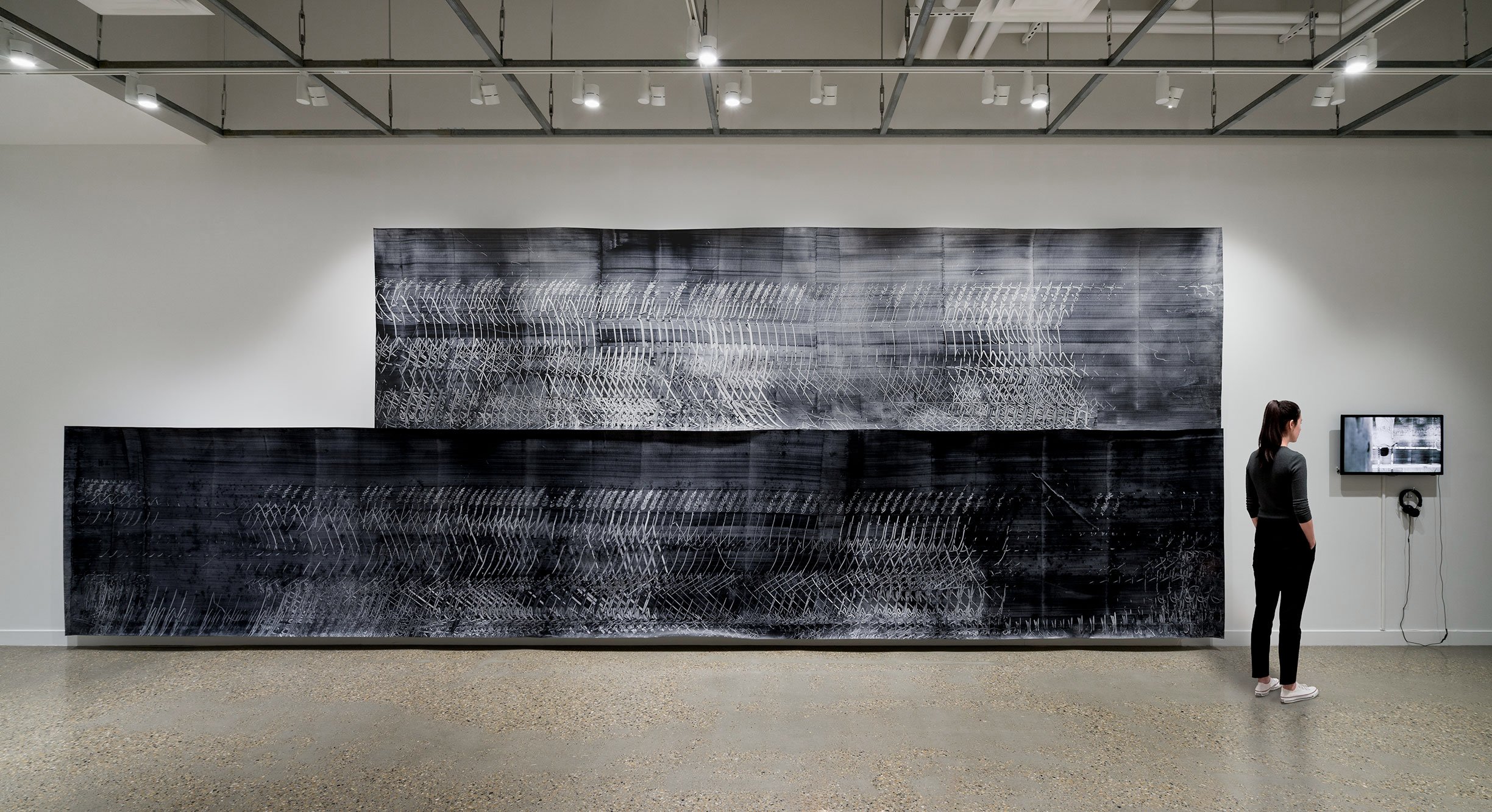 Executed in a single continuous pass across the surface, these 20 and 28 feet drawings emerge through interdependencies between the system, physical constraints, human error and intent rather than expressive gesture.